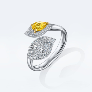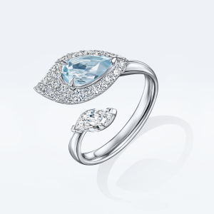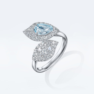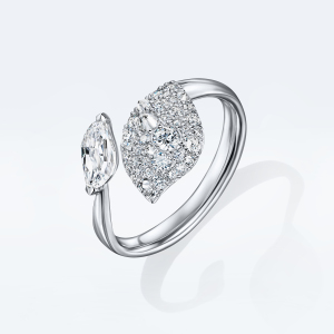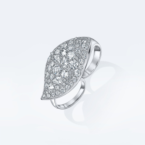 Кольцо на два пальца в виде крупного лепестка с бриллиантовой инкрустацией — иконический объект коллекции. В украшении используется приём сочетания разных форм и размеров драгоценных камней, уже ставший узнаваемым почерком POSIÉ. Крупные бриллианты закреплены шипом вверх, что создаёт особый динамичный рисунок сверкающего паве и многократно усиливает блеск.
