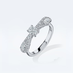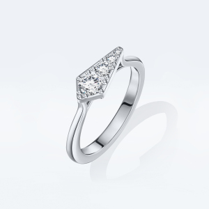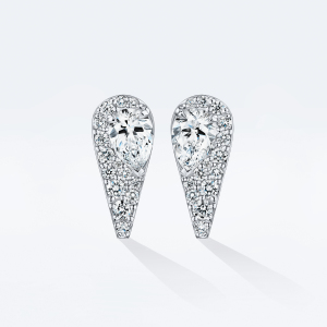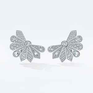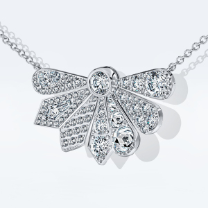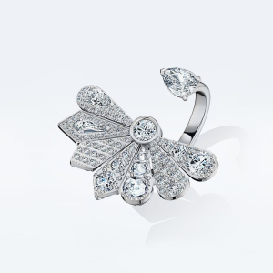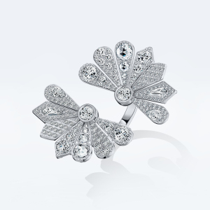 Главная особенность огранки «роза» — благодаря особой форме бриллиант заставляет круглые бриллианты вокруг сиять ярче, еще больше выделяя его. При этом сочетание крупных бриллиантов разной огранки с искрящимся бриллиантовым паве являет все многообразие сложных фактур, органично вписанных в нетривиальную форму веерного лепестка.