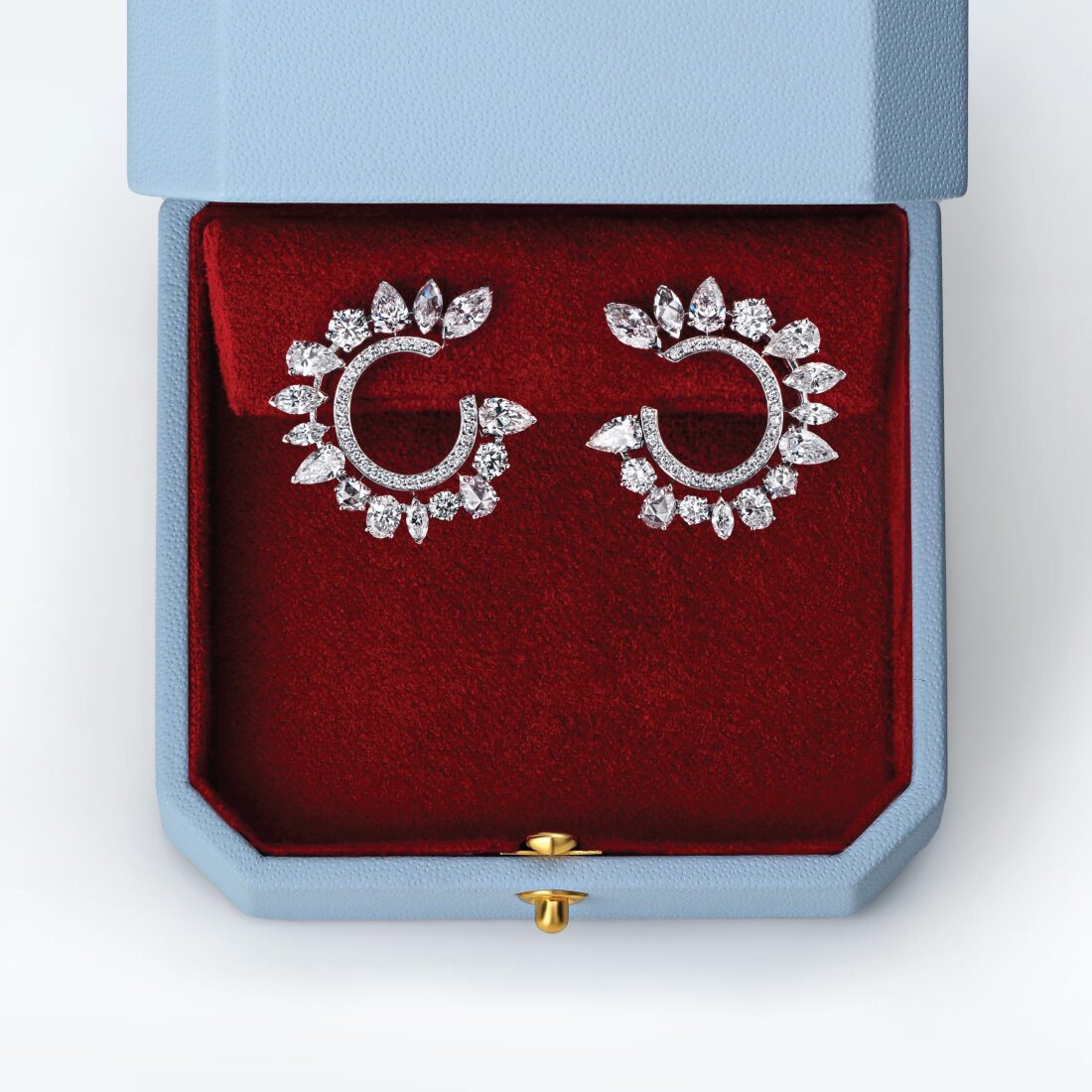 Серьги в форме несомкнутых колец состоят из двух драгоценных ободков: первый расположился по внутренней кромке украшения и представляет собой тонкую ленту из белого золота с непрерывной инкрустацией из круглых бриллиантов, второй обрамляет его с внешней стороны и состоит из бриллиантов огранки «маркиз», «круг», «груша», «овал», «роза» и «роза маркиз», непоследовательно закрепленных на небольшом расстоянии друг от друга.