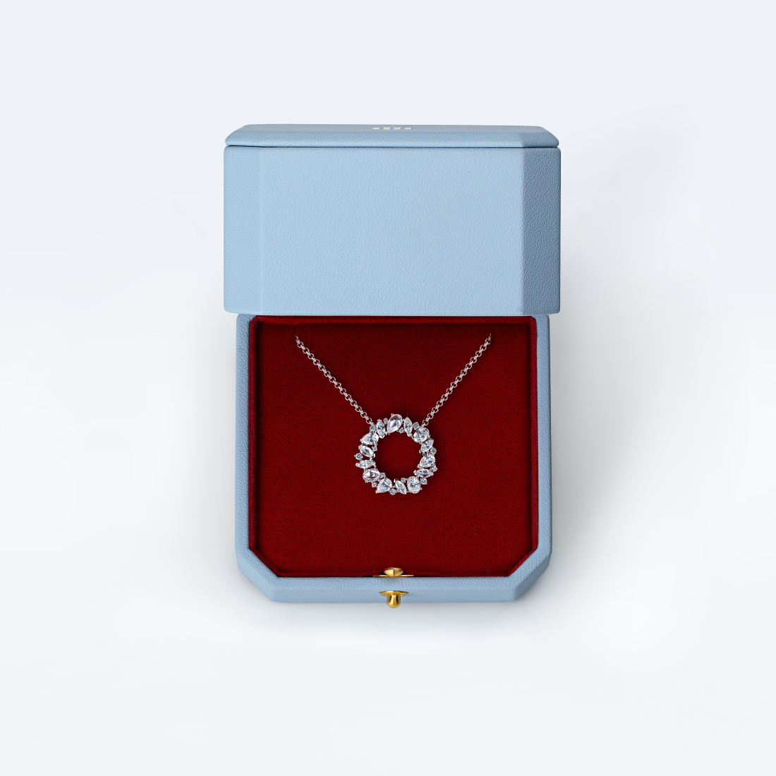 Колье из белого золота на тонкой цепочке украшает миниатюрная подвеска в форме кольца, выложенного из бриллиантов различных огранок — «круг», «овал», «маркиз», «груша», «роза овал», «роза груша» и «роза маркиз». Асимметричный мозаичный узор позволяет особенным образом рассеивать свет, придавая украшению фактурный объем.