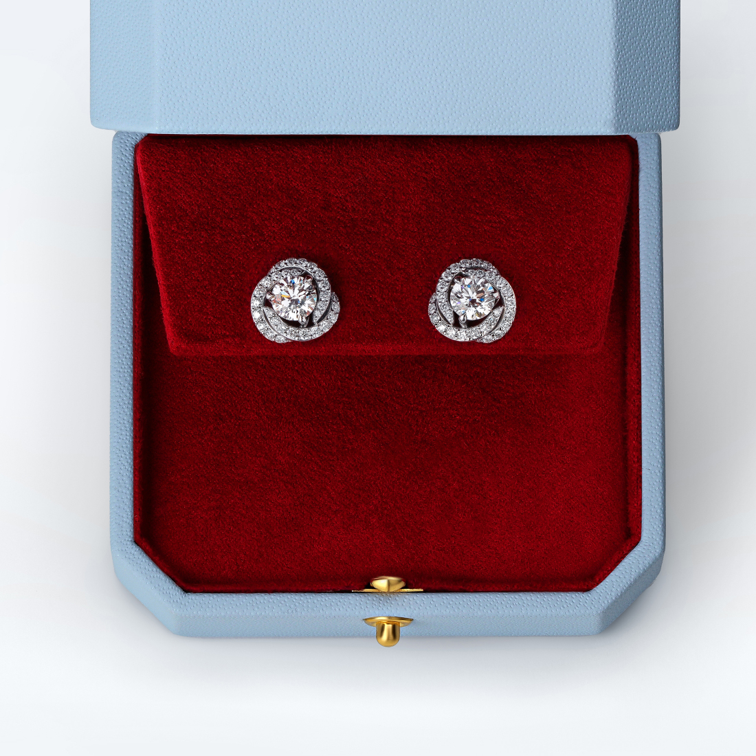 Минималистичный дизайн пусетов сложен из трех дугообразных линий круглых бриллиантов, которые ложатся одна на другую. В центре каждой серьги сияет бриллиант огранки «круг».