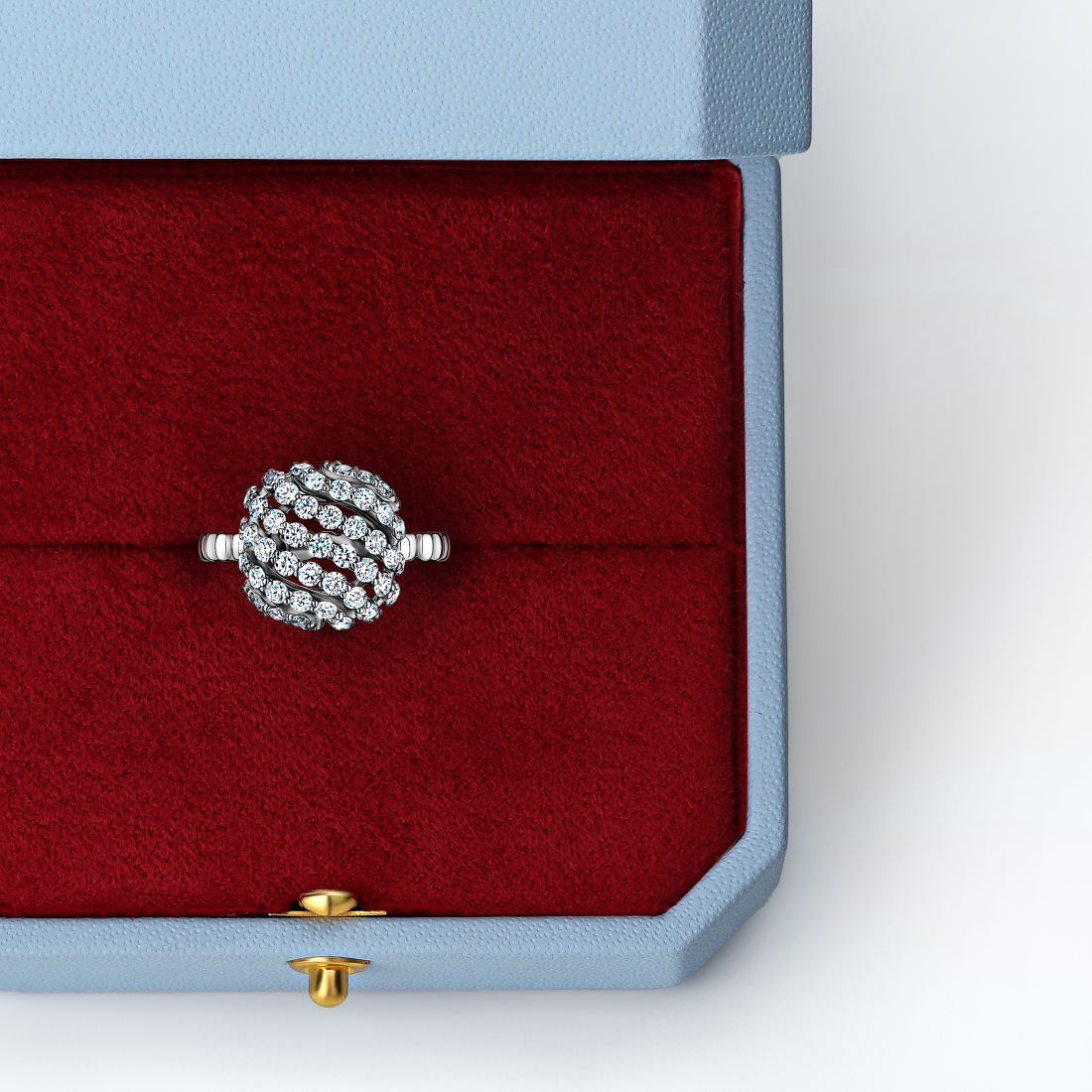 Элегантное, но при этом утонченно дерзкое кольцо «Пике» — одно из самых интересных украшений коллекции. Главный мотив — драгоценная пуговица из волнообразных линий круглых бриллиантов — венчает необычный рифленый ободок кольца, который будто составлен из гранул белого золота. Объемная форма главного декоративного элемента благодаря просветам между рядами драгоценных камней словно парит в воздухе, создавая ощущение эфемерной легкости.