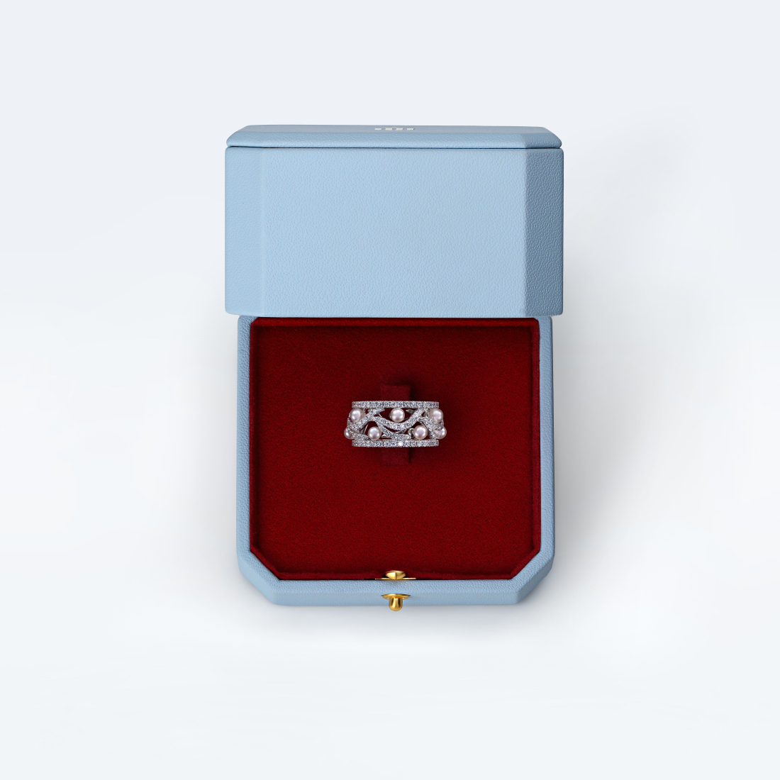Кольцо «Коронация» похоже на драгоценную тесьму роскошных императорских нарядов. Два ряда классических круглых бриллиантов обрамляют нежную флоральную композицию из переплетающихся ветвей лавра, которые элегантно украшены точечными дополнениями из безупречных жемчужин.