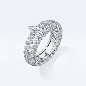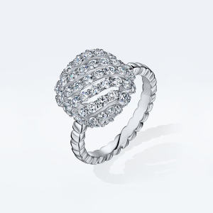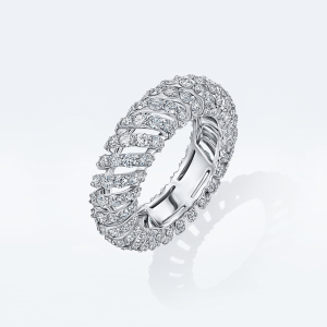 Основа коллекции «Пике» — сдержанность и минимализм, которые воплощены в ритмичном узоре плавных бриллиантовых нитей, складывающихся в лаконичную форму мягкого квадрата.